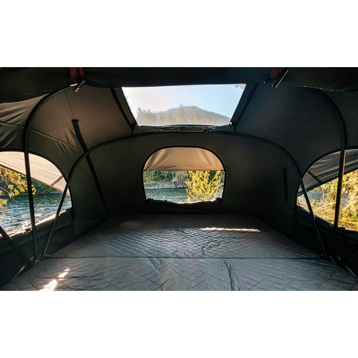 Het aluminium vloerpaneel klapt uit en creëert zo een ruime slaapruimte. Je zult geen ander hardshell-daktent vinden dat comfort en ruimte zo goed in balans brengt als deze.